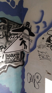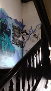 Im Treppenhaus vom Büchsenstadl findet man neben dem Graffiti jetzt auch ein Freiraum-Motiv. Der Bezugspunkt ist hier die erste Treppenstufe - aus diesem Blickwinkel heraus sieht das Bild perspektivisch korrekt aus.